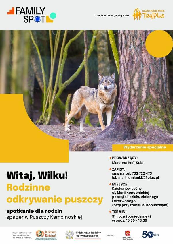 W poniedziałek 31 lipca w Family Spot Łomianki zapraszamy całe rodziny na rodzinny spacer w Puszczy Kampinoskiej. Spotkanie będzie poświęcone największemu drapieżnikowi, którego możemy tutaj spotkać, a mianowicie wilkowi.