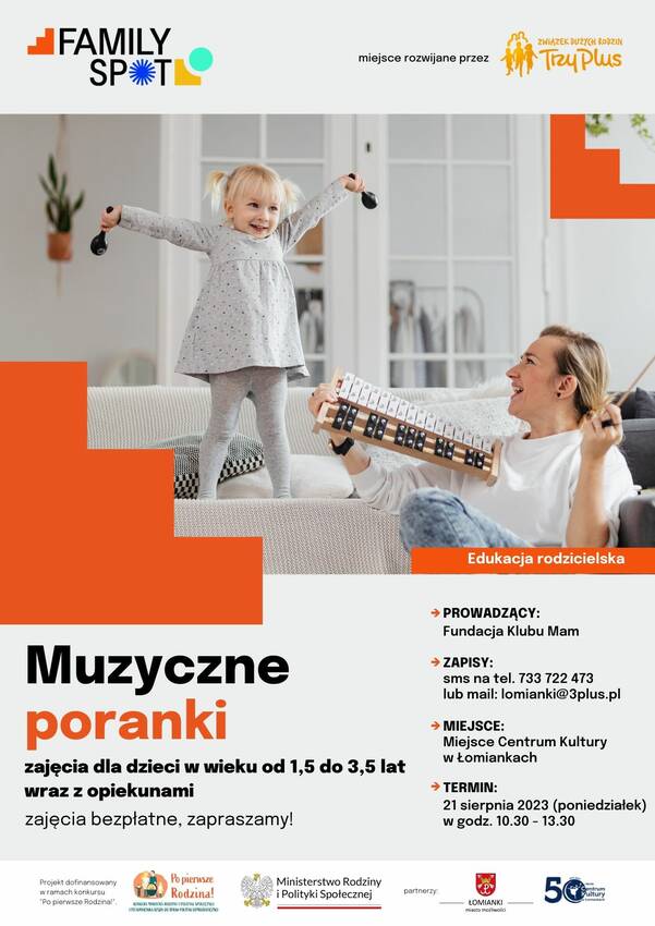 Zapraszamy już 21 sierpnia do Centrum Kultury w Łomiankach rodziców z dziećmi na nasze Muzyczne poranki w Family Spot.